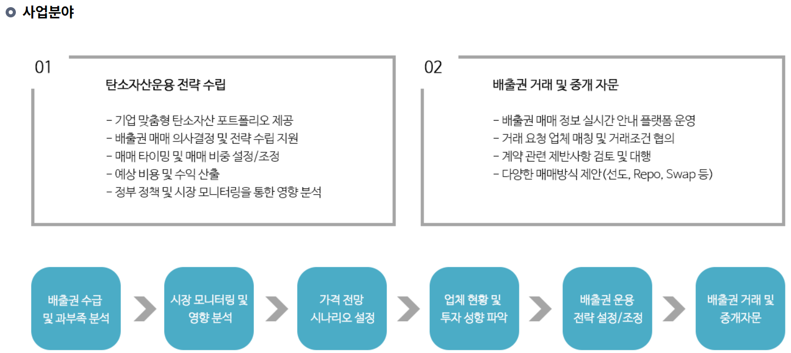 해당 회사에서는 경영기획부를 제외하고 3가지 사업권을 가지고 비즈니스 모델을 구성하고 있습니다. 탄소배출권사업, 탄소배출권운용, 지속가능사업 등 총 3가지로 비즈니스를 진행하고 있습니다.