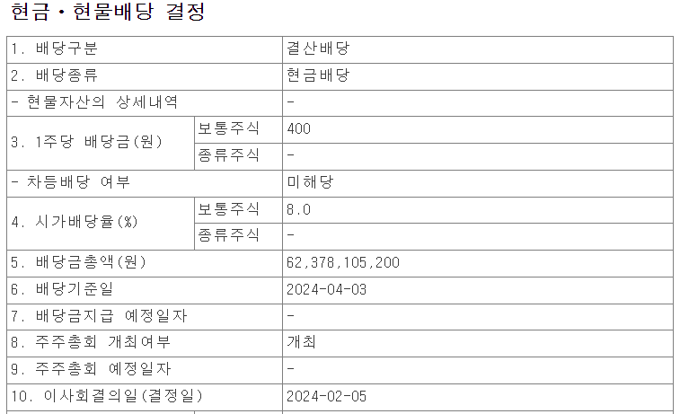 2024년도에 배당금을 주는 약관의 바뀌게 되면서 배당기준일이 2023년에도는 말년 기준일로 반영이 안되고 2024년 4월 3일에 배당금 기준일이 설정되었습니다. 만약 해당 주식을 통해서 배당금을 받고자 하는 분이 있다면 24년4월3일까지 주식을 보유하셔야 합니다.