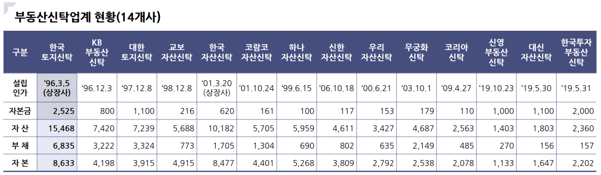 부동산 신탁산 14곳에는 한국토지신탁을 포함하여 KB부동산신탁, 대한토지신탁, 교보자산신탁, 한국자산신탁, 코람코자산신탁, 하나자산신탁, 신한자산신탁, 우리자산신탁, 무궁화신탁, 코리아신탁, 신영부동산신탁, 대신자산신탁, 한국부동산시탁사가 경쟁을 펼치고 있는 시장입니다. 하지만 코스피 상장사 중 부동산 신탁사업 단독으로 상장되어 있는 회사는 한국토지신탁뿐이며 다른 기업들은 금융그룹에 속한 자회사로 존속하고 있습니다. 위 도표에서 알 수 있듯이 자본금과 자산 부채가 가장 큰 회사로 한국토지신탁이 1등 기업이라고 할 수 있습니다.