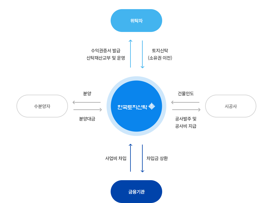 토지대금과 사업비를 PF 또는 시공사의 지급보증 등에 의해 조달하고 당사는 자금 투입없이 공정 및 분양관리 등을 대행하는 사업방식으로, 개발사업 안정성 증대를 위해 시공사 + 시행사 구조의 단순개발 사업형태에서 나아간 신탁사 + 시행사(위탁사) + 시공사의 복합개발 사업형태 입니다.