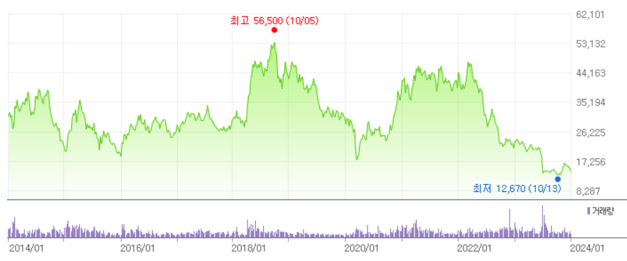 악재의 뉴스가 많지만 주가는 최근 10년 이래 가장 아래에서 형성되고 있는 형국 입니다. 어떤 이에게는 투자기회가 될 수 있으며, 또 다른 이에게는 악재의 뉴스로 보일 수 있습니다. 이러한 차이는 투자스타일에 대한 차이가 아닐까 생각합니다.