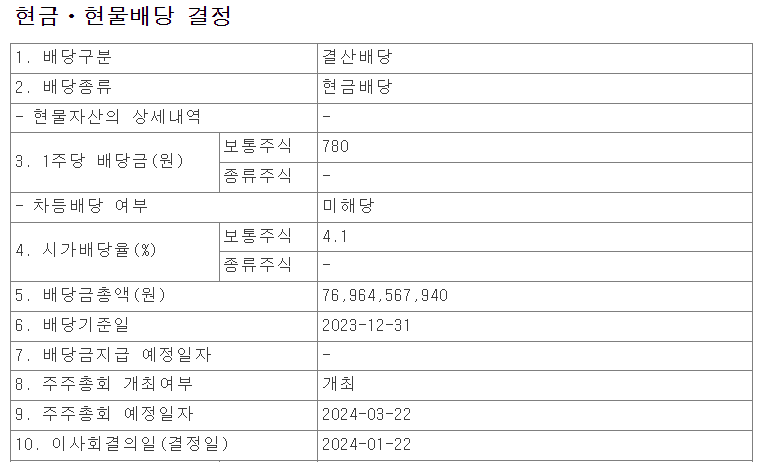 배당기준일은 2023년 12월 31일이며 780원을 배당한다고 발표하였으니 참고 하시면 좋을거 같습니다.