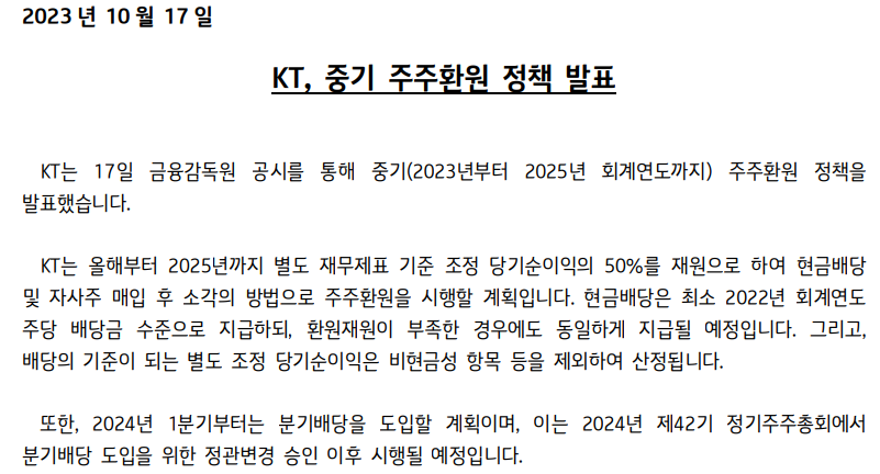 KT는 17일 금융감독원 공시를 통해 중기(2023년부터 2025년 회계연도까지) 주주환원 정책을 발표했습니다. KT는 올해부터 2025년까지 별도 재무제표 기준 조정 당기순이익의 50%를 재원으로 하여 현금배당 및 자사주 매입 후 소각의 방법으로 주주환원을 시행할 계획입니다. 현금배당은 최소 2022년 회계연도 주당 배당금 수준으로 지급하되, 환원재원이 부족한 경우에도 동일하게 지급될 예정입니다. 그리고, 배당의 기준이 되는 별도 조정 당기순이익은 비현금성 항목 등을 제외하여 산정됩니다. 또한, 2024년 1분기부터는 분기배당을 도입할 계획이며, 이는 2024년 제42기 정기주주총회에서 분기배당 도입을 위한 정관변경 승인 이후 시행될 예정입니다