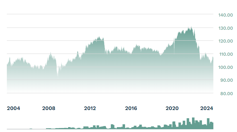 근 20년동안 거이 오르지 않았습니다. 하지만 폭락한 이후에 가파른 상승이 나오고 있는 추세 입니다. 이거를 만약 20년 동안 보유했다면 매월 받는 분배금만을 받는게 고작인 수익률을 달성했다고 볼 수 있습니다. 하지만 3~4%의 수익률이라도 잃지 않고 재투자를 하는 과정이라면 적금풍차나 예금풍차 돌리기 같은 효과가 있을 수 있으며, 환율이 오르는 구간에서는 엄청난 재미를 볼 수 있다는 것이 적금풍차돌리기나 예금풍차돌리기 보다 괜찮은 수익률이라고 생각을 합니다.