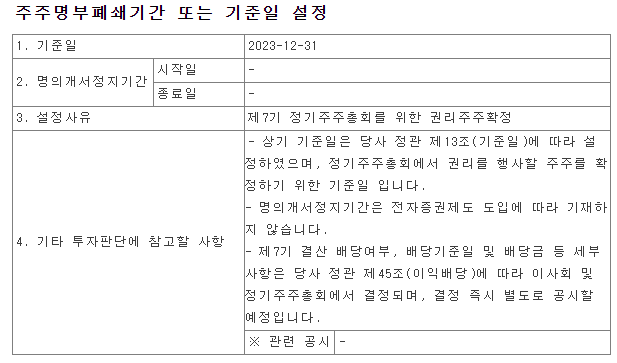 동아타이어는 1년에 한번 주주들에게 배당금을 지급하고 있습니다. 각 해년도 말일에 기준일을 설정하여 말일까지 보유한 주주들에게 배당금을 지급해 왔습니다. 하지만 2024년부터 바뀌는 배당제도에 따라 주주들에게 배당금을 공표하고 배당락을 실시한다는 관점에서 벚꽃배당을 실시하게 되었습니다.