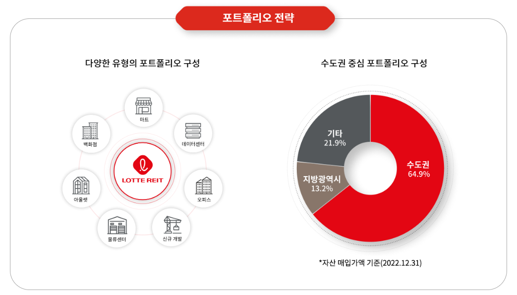 롯데리츠에서는 기존 임차인을 바탕으로 임대료를 기반으로 한 안정적인 배당수익률과 인플레이션에 대비한 장기적인 건물과 토지의 매각차익을 바탕으로 장기정인 투자를 이어가고 싶은 목표설정이 있습니다.