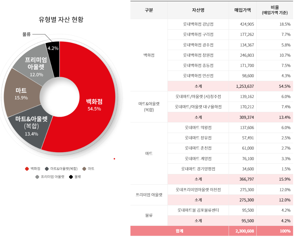 또한 기존의 마트와 백화점, 아울렛 이외에 물류센터와 데이터 센터, 오피스까지 편입을 할 예정이며, 수도권 중심의 롯데의 알짜배기 부동산들을 주식시장에 선보일 것으로 판단이 됩니다. 데이터센터와 오피스, 물류센터를 포트폴리오의 편입을 한다면 물류 중심의 임대차 리츠로 성장 할 것으로 판단이 됩니다.