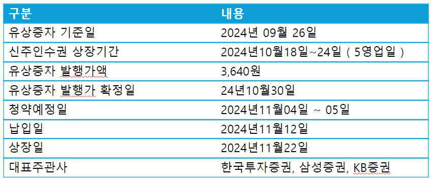이러한 기간이 지나고 청약가 확정이 되는데 청약가 확정일은 10월 30일 입니다. 아마 주가의 변동이 없다면 현 발행가액인 3,640원으로 청약가가 확정될 것으로 보 입니다. 확정가 이후 청약일인 11월 4일 부터 5일까지 해당 유상청약을 청약할 수 있으며 반대로 포기할 수 있습니다. 이러한 청약이후 납입일은 11월 12일 입니다. 납입이후 해당 주권은 2024년 11월 22일에 주식이 상장이 됩니다.