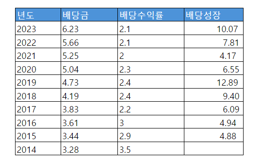 2024년도에는 위와 같은 배당금을 투자자들에게 돌려주었습니다. 꾸준히 배당을 성장해오고 있는 주식이다 보니 내년이나 내후년의 배당성장도 기대되는 종목이 아닐까 생각합니다.