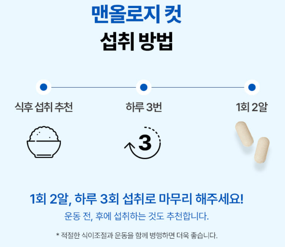 제품 설명서는 식후 섭취를 추천한다고 되어 있습니다. 하루 2알을 식후 섭취하는 방식입니다. 또한 여기에는 충분한 물과 함께 섭취하라고 되어 있으니 충분한 물과 함께 섭취하는 것이 도움이 될거 같습니다. 또한 위에서 살펴 보았듯이 운동기능과 피로감 회복이라는 효능이 있어 운동 전후에도 섭취하는 것이 좋을 것으로 생각이 됩니다.