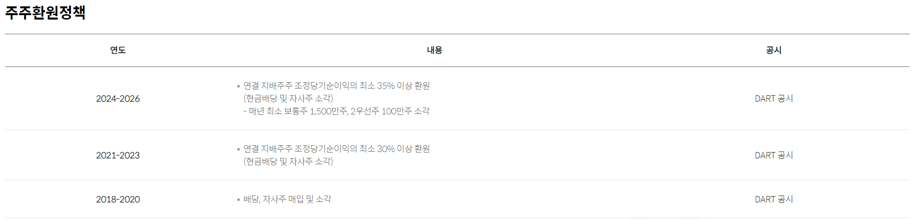 미래에셋증권은 주주들에게 더 많은 수익률을 제공하고자 이전보다는 강도 높은 주주환원 정책을 펼치고 있습니다. 2018년부터 배당과 자사주소각이라는 키워드로 주주환원 정책에 돌입하면서 2021년부터는 순이익30%이상 환원을 했으며, 2024년부터는 35%이상을 환원한다는 점직적으로 환원율이 높아지고 있는 추세 입니다.