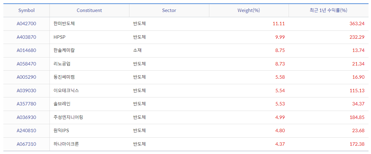해당지수를 구성하는 종목으로 한미반도체, HPSP, 한솔케미칼, 리노공업, 동진쎄미켐, 이오테크닉스, 솔브레인, 주성엔지니어링, 원익IPS, 하나마이크론 으로 지수를 구성하는 종목이 완성되었습니다. 이중에서 눈에 뛰는 수익률을 자랑하는 종목들이 너무나도 많은거 같습니다.