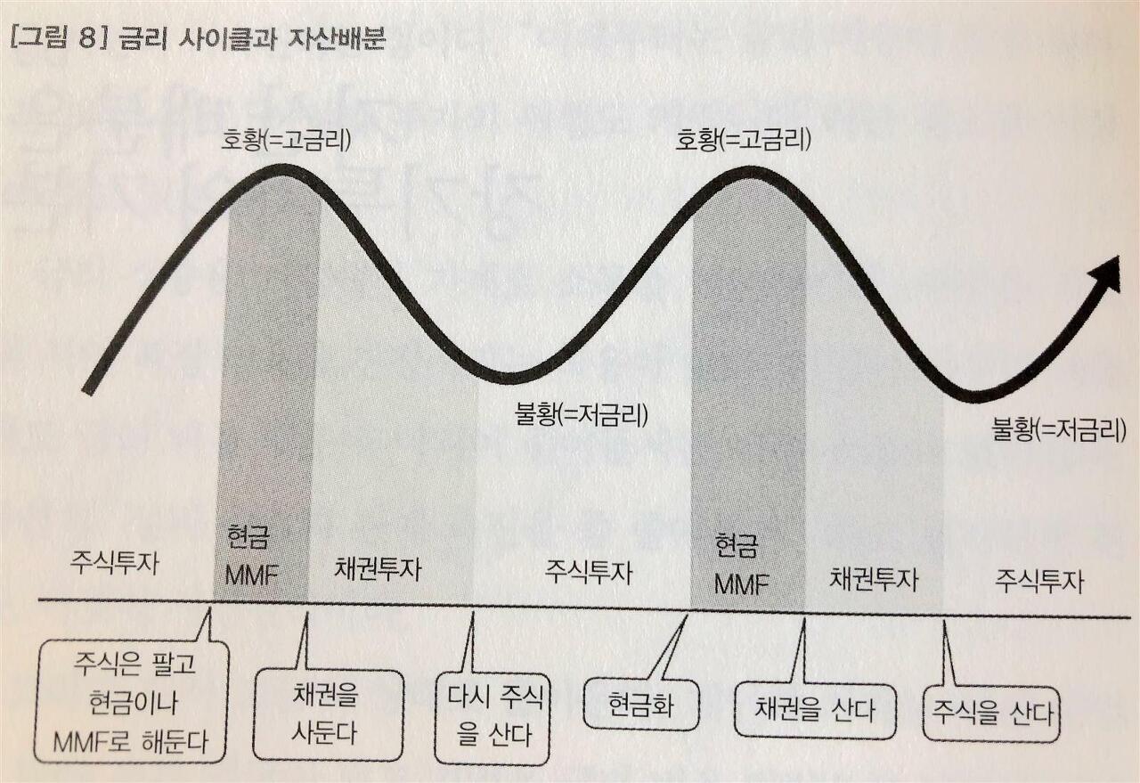 주식만 또는 채권만 한 우물을 파면 경기 사이클과 금리 사이클에 따른 운용은 불가능하다. 호경기에 주식이 비싸지면 싼 시기에 주식을 구입해둔 사람은 이익을 듬뿍 남길 수 있다. 그러나 채권밖에 없는 사람은 채권 가격의 폭락으로 손해를 본다. 한편 경기 사이클의 내리막길에서는 주식은 위험에 걸맞은 수익을 가져다주지 않는다. 이 시기는 위험이 한정되고 가격 상승이 기대되는 채권투자가 짭짭하다. 다시 말해 가장 합리적인 운용은 경기(금리) 사이클에 맞춰 주식, 현금, 채권, 그리고 다시 주식 순으로 운용 대상을 이동해가는 것이다.