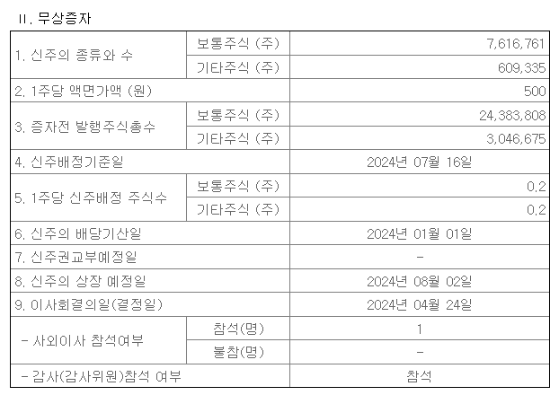 당사는 2024년 04월 24일 개최된 이사회에서 무상증자를 결의하였으며, 유상증자 납입일(2024년 07월 11일)의 3영업일 후인 2024년 07월 16일을 무상증자 신주배정기준일로 하여, 유상증자 후 주주명부에 기재된 주주(자기주식 제외)에 대하여 소유주식 1주당 0.2주의 비율로 보통주 신주를 무상으로 배정하는 증자를 시행할 예정입니다. 금번 유상증자로 인해 발행되는 보통주 신주의 경우에도 자동적으로 무상증자에 참여하여 신주를 받을 수 있는 권리가 발생합니다. 본 무상증자 계획은 관계기관의 조정 또는 증권신고서 수리과정 등에서 변경될 수 있습니다. 또한, 기타 본 건 신주 발행을 위하여 이사회에서 정하지 않은 사항 및 제반 계약서의 체결, 부수사항 및 제비용 집행 등 세부사항은 대표이사에게 위임합니다.
