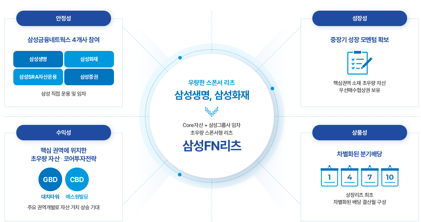 삼성생명에서 자산의 유동화를 주식시장을 통해 부동산 상품을 상장화한 리츠 입니다. 삼성생명에서 가지고 있는 자산들은 대한민국에서 가치가 있는 입지의 자산들이 많습니다. 대부분의 건물들이 사람들이 자주 모이는 유동성이 풍부한 곳에 건물들을 가지고 있기 때문입니다. 삼성FN리츠는 2022년 7월 26일에 설립하여 2023년 4월 상장하였으며, 현재까지 주식시장에서 투자자들을 모으고 있는 리츠 입니다. 삼성자산에서 선보이는 최초의 리츠이기도 하다. 공모가는 5천원 이었고 총 발행주식수는 77,300,000주 이다.