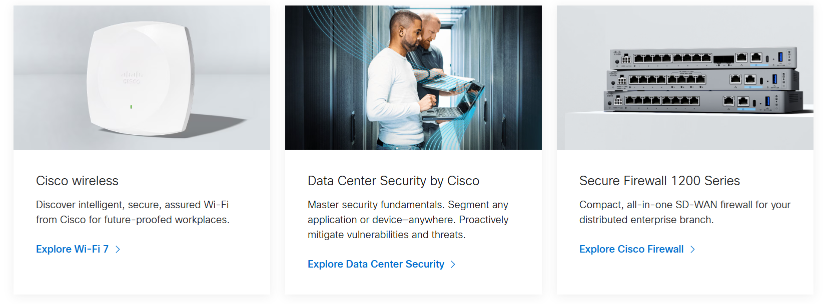 스위칭 제품, 공개 및 개인 유선 또는 모바일 네트워크를 상호 연결하는 라우팅 제품, 데이터 센터 제품, 음성, 비디오 및 데이터 애플리케이션에 사용하기 위한 무선 액세스 포인트(WAP) 등의 제품들이 있습니다.