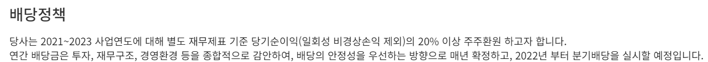 위 공문과 실제 데이터로는 배당성향이 아쉬운 점이 있었습니다. 번 돈의 20% 이상을 배당하기로 하였으나 실제로는 2021년, 2022년에는 20% 이상을 배당을 하지 않았기 때문입니다. 하지만 기업의 입장에서 본다면 과도한 배당성향은 해당 산업에서 위기 대응을 못하는 구실이 될 수 있기에 점진적으로 배당을 늘리며 주주들에게 배당을 준다는 것이 주주들과의 약속을 지키며 기업의 실리를 추구한다고 볼 수 있겠습니다.