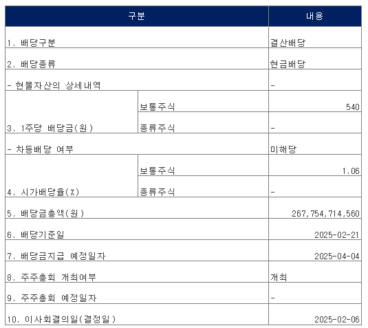 신한금융지주가 2024년 결산 배당금을 공시 하였습니다. 1주당 540원을 공시하였으며, 시가 배당률은 1.06% 입니다. 이번 배당 기준일은 2025년 2월 21일이며, 해당 배당을 받기 위해서는 2월 19일 까지는 해당 주식을 매수해야지만 배당금을 받을 수 있습니다.