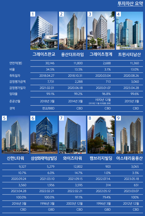 신한알파리츠의 포트폴리오는 주요 도심권역에 위치하고 있는 자산들이 많습니다. 1호 건물은 그레이스 판교, 2호 건물은 용산더 프라임, 3호 건물은 그레이스 청계, 4호 건물은 트윈시티 남산, 5호 건물은 신한 L타워, 6호 건물은 삼성화재역삼빌딩, 7호 건물은 와이즈 타워, 8호 건물은 캠브리지 빌딩, 9호 건물은 아스테리움 용산 입니다.