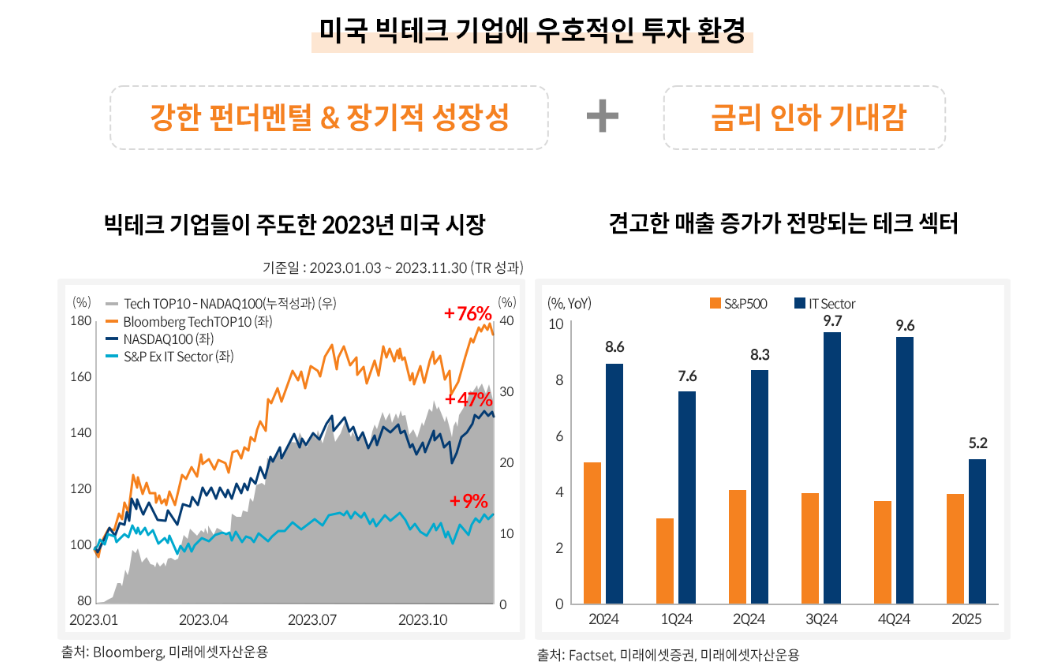미국 빅테크 기업들의 시장지배력이 더욱 강화되면서, 나스닥100 지수 내 TOP10 종목의 비중이 지속적으로 증가하고 있습니다. 나스닥100 지수는 2023년 7월 특별 리밸런싱을 진행했지만 여전히 TOP10 종목 비중은 50%에 육박하고 있습니다. 연초 이후 성과를 보면, TOP10의 수익률이 나스닥100 수익률을 크게 앞지르면서, 약 30%의 누적 초과 성과를 기록했습니다. 이러한 성과가 가능했던 이유는 무엇보다 빅테크 기업들이 강한 펀더멘털을 보유하고 있기 때문이기에 세계에 돈이 몰리고 있다고 생각합니다. 테크 섹터는 올해도 작년대비 낮은 이자 부담과 신성장동력인 AI를 발판 삼아 매출이 탄탄하게 증가할 것으로 전망되고 있습니다. 게다가 올해는 금리 인하 기대감까지 더해져 기술주/대형주 투자에 더욱 긍정적인 환경이 펼쳐지고 있는 상황입니다.