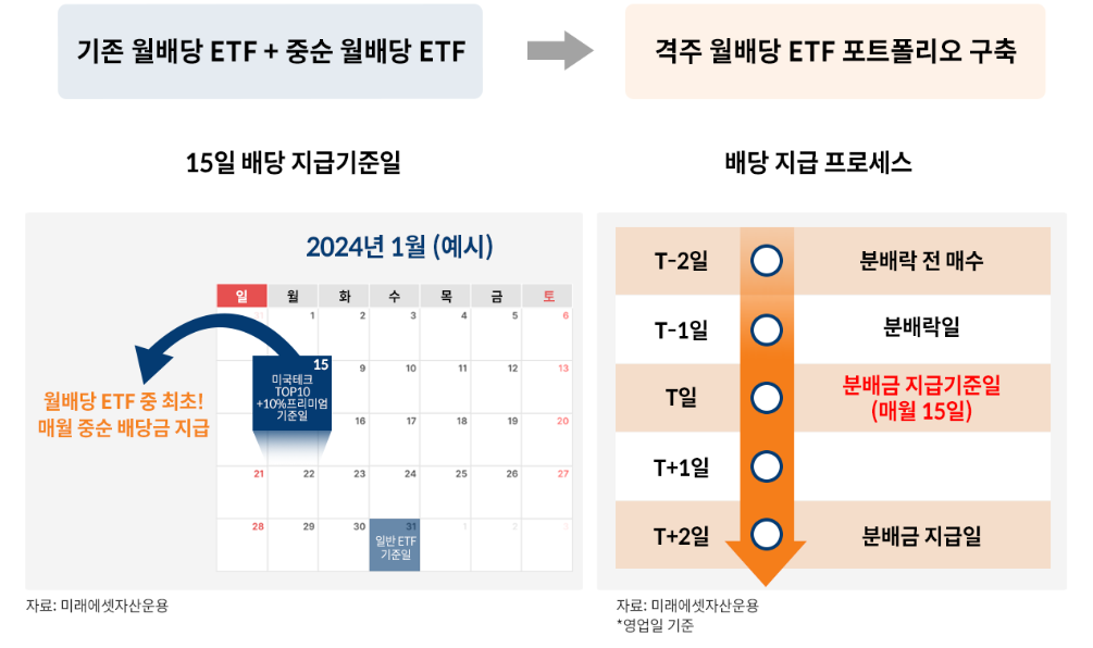 기존 국내 상장 ETF의 경우 매월 마지막일을 기준으로 분배금 지급 주기를 결정하였습니다. ETF를 투자하는 투자자가 있다면 이런 날을 꼬박 기다리시는 분들이 많을 것이라고 생각을 합니다. 그런데 해당 ETF에서는 기존의 방식과는 달리 매월 중순에 분배금을 지급하면서 기존 ETF에서 제공하는 유동성의 기준일을 달리 가져갈 수 있다는 것이 장점이라고 생각합니다. 특정한 날에 분배금이 지급되다 보면 유동성이 말라지는 때가 있으니 유동성의 분산을 가져갈 수 있습니다.