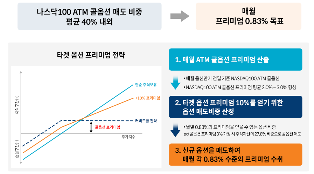 - 구성종목: 옵션 만기 전일 기준 등가격 옵션으로, 연간 프리미엄 10%(월별 프리미엄 83bp)가 되는 수준의 e-mini NASDAQ100 ATM 콜옵션 매도