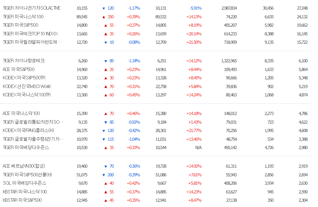 하지만 시가총액의 높은 ETF들이 지수와 ETF의 가격관의 괴리율을 최소화 하여 투자를 할 수 있기에 ETF 자체의 시가총액을 보고 시가총액이 큰 ETF의 투자를 하는 것이 유리합니다. 또한 ETF도 펀드이기에 펀드가 없어질 수 있다는 점을 유의 해야합니다. 이러한 이유로 시가총액이 큰 ETF를 투자를 하는 것이 안정성면에서는 정말 유익합니다. 대한민국 운용사 중 제일 큰 운용사는 단연콘 미래에셋자산운용인거 같습니다. 위와 같이 큰 시가총액을 유지할 수 있다는 것이 그것을 증명을 합니다. 위에 시가총액별 ETF를 보시면 TIGER ( 미래에셋자산운용 ), KODEX ( 삼성자산운용 ), ACE ( 한국투자신탁 ), KBSTAR ( KB자산운용 ), SOL ( 신한자산운용 ) 대략 이렇게 5개의 운용사들이 시장을 선도하고 있다고 보면 되겠습니다.