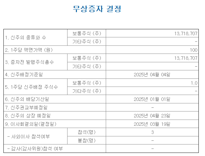 주식회사 제이에스코퍼레이션이 무상증자를 발표하게 되었습니다. 해당 무상증자의 배정율 1배이며 1주를 가지고 있으면 1주를 받을 수 있습니다. 신주의 배정기준일은 2025년 4월 4일이며, 4월 2일까지는 매수를 해야지만 무상증자를 받을 수 있습니다. 해당 무상권리락으로 받는 주식은 2025년 4월 23일에 계좌로 입고가 됩니다.