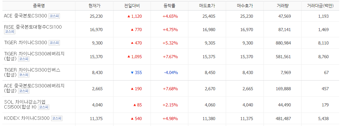 어떠한 테마가 잘 모르겠다면 중국전체에 투자하는 인덱스 ETF에 투자를 하는 것이 가장 현명하다고 생각을 합니다.  중국의 대표 지수가 CSI지수이니 증권사에서 제공하는 프로그램에서 CSI를 검색을 한다면 충분히 매수하실수 있습니다.