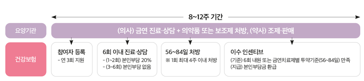 - 8주에서 12주 기간 동안 6회 이내, 의사의 전문적인 진료·상담과 금연치료 의약품 또는 니코틴보조제(니코틴패치, 껌, 정제) 구입비용의 일부를 지원받게 됩니다.