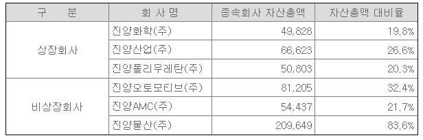 진양홀딩스는 주식의 소유를 통하여 국내회사의 사업내용을 지배하는 것을 주된 사업으로하는 지주회사로서 2008년 1월 7일부로 진양산업㈜, 진양화학㈜, 진양폴리우레탄(주)의 투자사업부문을 각각 분할함과 동시에 합병하여 설립되어 2023년 12월 31일 현재 8개의 자회사 및 5개의 손자회사를 두고 있습니다.