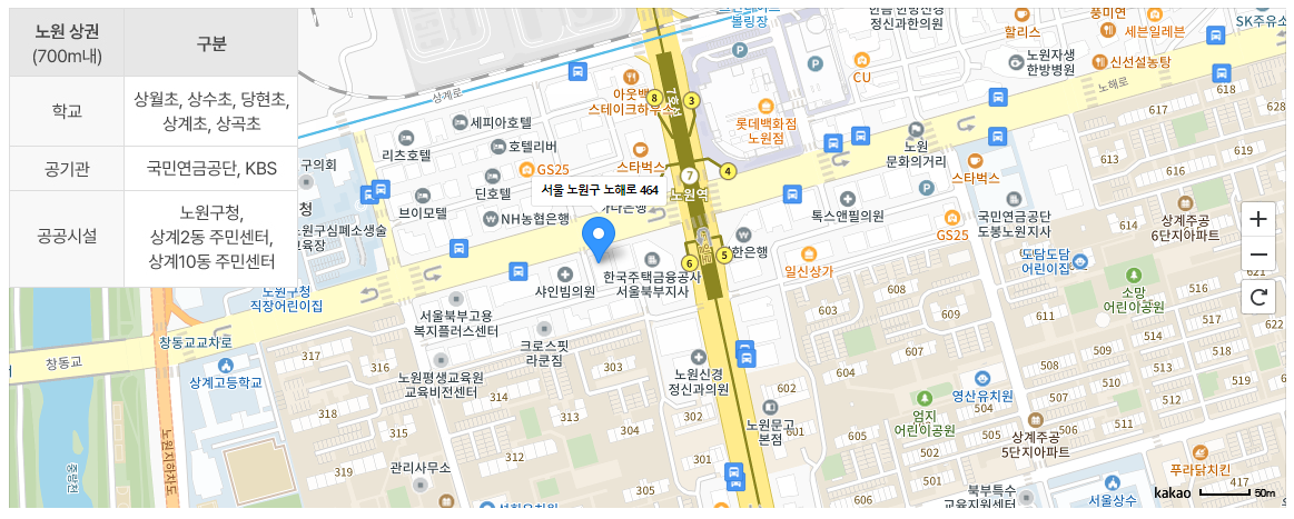 해당 건물은 더블역세권인 노원역(4,7호선)에서 도보 1분 거리이며, 인근 버스정류장 15소의 60여개 노선과 지하철을 통해 7호선에 위치하고 있습니다. (건대입구, 압구정, 논현) 및 4호선 권역으로 서울 전역으로의 접근성이 뛰어난 입지입니다. 또한 인근 대규모 아파트단지(약 14,200세대)의 수요를 바탕으로 주변 수요로 인해오피스 및 리테일의 안정적 임차 및 임대소득 유지가 가능합니다.