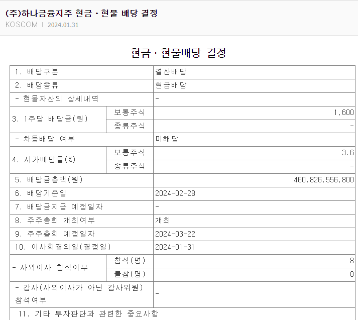 하나 금융지주는 2023년 결산 배당을 2024년 2월 28일 기준일자로 주식을 보유한 주주들에게 배당금을 지급한다고 발표하게 되었습니다. 해당 주식의 배당금은 1주당 1,600원의 배당금을 지급한다고 발표하였습니다. 하나금융지주의 경우 2월 26일까지는 매수를 하여야 해당 배당금을 받을 수 있으니 하나금융지주의 배당금을 받고자 하는 분들이 있다면 해당 일짜까지는 매수를 하시기를 추천드립니다. 반대로 세금 문제 때문에 배당금을 줄이고자 하는 분이 있다면 매도를 준비해야 됨을 잊지 말아주십시오.