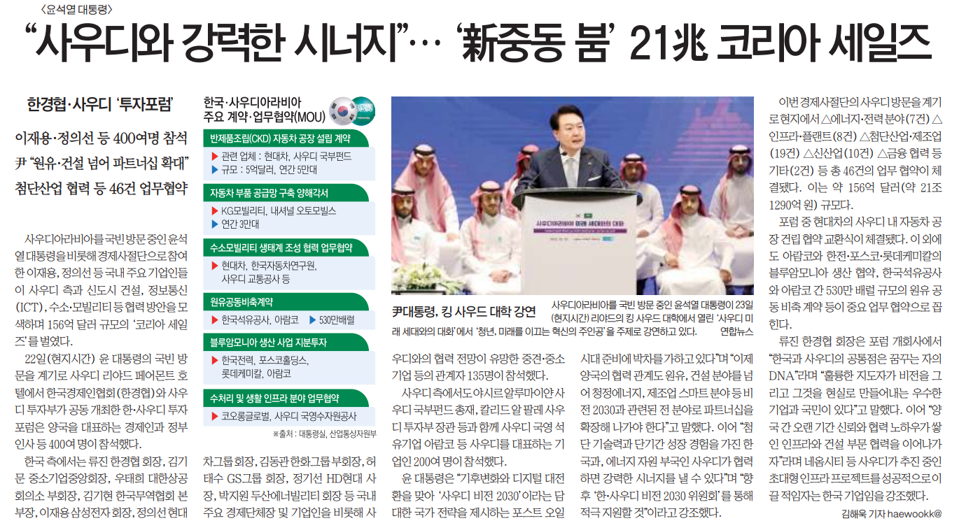금일 윤석열 대통령이 사우디아라비아을 방문하여 경제협약을 체결 했습니다. 여기서 대한민국의 현대차, KG모빌리티, 한국전력, 포스코, GS , 두산에너빌리티 등의 기업들이 참석하여 사우디 국부펀드오 경제 협약을 약속하는 MOU를 발표 했습니다. 기존에는 건설과 인프라, 자원등의 극한된 반면에 이번 협약으로 청정에너지, 제조업 스마트 분야등 다양한 비전의 경제협약이 있었습니다.