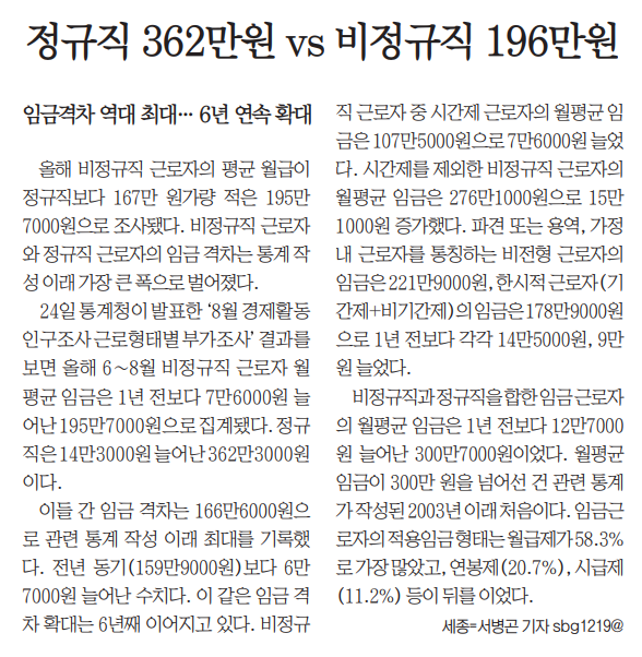1. 정규직/비정규직 임금 격차 6년연속 확대