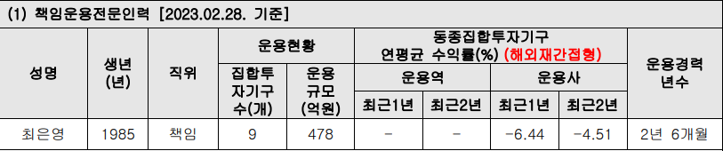 운용역들의 스펙은 정말 화려합니다만 보고서에 적힌 수익률은 조금 아쉬운 점이 있습니다. 다만 아쉬운 수익률은 채권시장이 상황이 안좋기 때문이지 않을까 생각합니다.