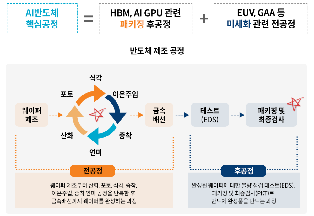 이러한 HBM 반도체를 만들기 위해서는 고도의 핵심공정 기술이 필요합니다. 반도체 제조 과정을 웨이퍼를 완성하는 전공정과 완성된 웨이퍼를 테스트하고 패키징해 완성품을 만드는 후공정으로 나누는데, AI 반도체에 있어서 중요한 건 패키징과 미세화입니다. 해당 기술을 보유하고 있는 국내 기업들이 있으며, 이러한 국내 기업들이 수혜를 볼 것으로 전망이 됩니다.