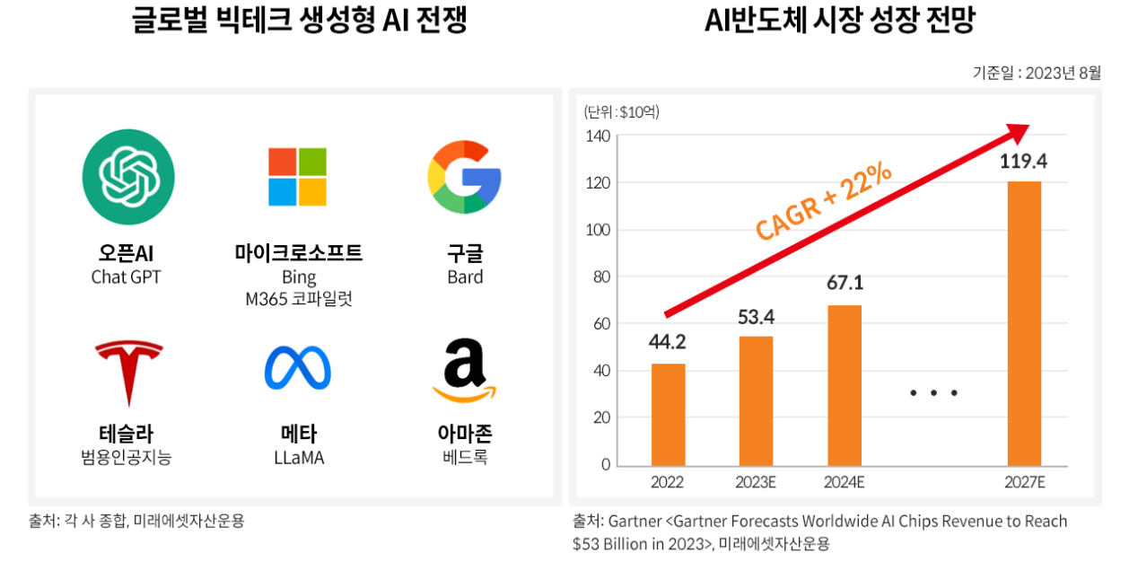 2022년 Chat GPT 등장 이후 마이크로소프트뿐만 아니라 구글, 메타, 아마존, 테슬라,애플 등 글로벌 빅테크 기업들은 생성형 AI 전쟁에 뛰어들고 있습니다. 천문학적 투자와 인수합병을 통해 AI 기술 개발에 열을 올리는 한편, AI 시스템에 필요한 서버 인프라 투자에도 적극 나서고 있는 상황입니다. 이러한 AI의 경쟁우위는 얼마나 많은 양의 데이터를 얼마나 빠르게 연산할 수 있는지에 따라 성능이 좌우됩니다. 그래서 우선 많은 양의 데이터를 처리할 수 있는 시설을 확보하는 것이 중요하게 되는데, 빅테크 기업들의 AI 서버 투자로 인해 고가의 AI 서버용 반도체 수요가 폭증하고 있습니다. 시장조사업체안 가트너(Gartner)는 AI반도체 시장 규모가 2022년 442억 달러에서 2027년 1,194억 달러로 연간 22%씩 크게 성장할 것으로 전망하고 있습니다.