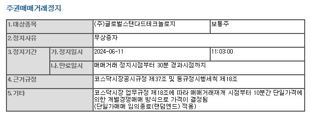 GST 무상증자 공시로 인해서 매매정지가 발생하게 됩니다.