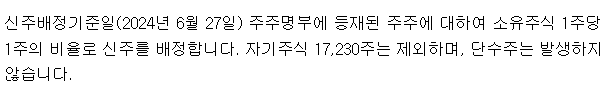 신주의 배정기준일은 2024년 06월 27일 입니다. 무상증자의 배정을 받기 위해서는 기준일 2영업일은 6월 25일까지는 주식을 매수해야지만 해당 증자를 받을 수 있습니다.