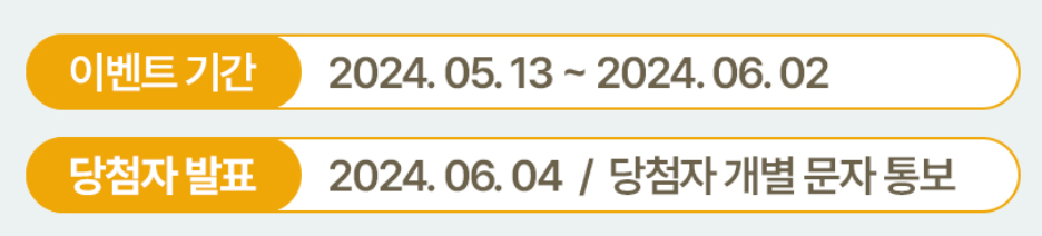 해당 이벤트는 2024년5월 13일부터 2024년 6월 2일까지 신청할 수 있습니다. 이벤트 참여 후 당첨자 발표는 개별 문자로 통지가 되며 2024년 6월 4일에 발표가 됩니다.