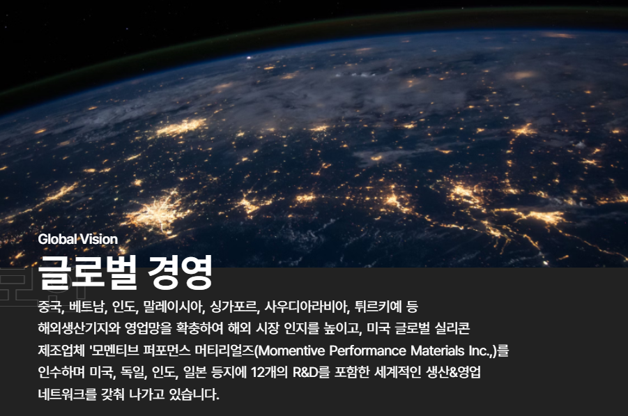 실리콘 산업은 일반 소비자들이 사용하는 생활용품등의 소비재 시장의 견조한 시장 성장을 바탕으로 실리콘의 뛰어난 물성으로 자동차, 전기전자 등 각종 산업에 응용처가 확대되고 있습니다. 최근 전기차 시장의 성장과 고령화에 따른 의료용 수요 증대로 고부가가치 실리콘 제품을 중심으로 더욱 높은 시장 성장이 전망되고 있습니다.
