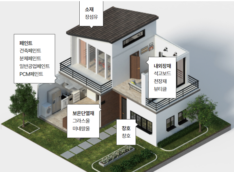도료 부문의 주요 제품으로는 건축도료, 중방식도료, 분체도료, 일반공업도료, PCM도료, 자동차도료, 플라스틱 도료 등이 있으며 건설, 자동차, 조선, 전자 등의 다양한 산업의 원재료로 쓰이는 것은 물론 개인들의 가정용 수요 등 다양한 방면에 사용된다는 특징을 가지고 있습니다.
