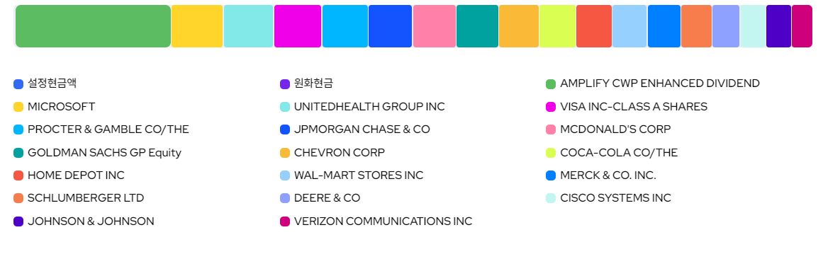해당 ETF의 모태가 되는 DIVO ETF가 가장 메인으로 비중을 차지하고 있습니다. 이러한 비중 이외에도 투자자들이 가장 많이 관심을 가지는 애플과 마이크로소프트를 보유하고 있으며 ( 이러한 주식들도 배당을 성장하고 있는 주식들 입니다. ) 기존의 전통적인 배당 강호인 존슨앤존슨과 캐터필러, 머크, 월마트, 쉐브론, P&G 등 미국의 우량 배당성장주들이 대거 포함된 모습을 보이고 있습니다.