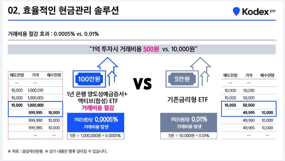 Kodex 1년 은행 양도성예금증서+액티브(합성)은 1주당 100만원대로 상장하여, 촘촘한 호가에 따른 거래비용을 최소화할 수 있다는 장점이 있습니다. 즉, 매수/매도 호가가 풍부하다는 뜻인데요, 모든 호가 가격 단위는 5원이기 때문에 1주당 5만원의 ETF와 비교하면 거래비용의 절감 효과가 약 95% 가량 나타나게 됩니다. 1억을 투자했을 때 거래비용이 500인 것과 10,000원인 것을 비교하면 훨씬 이해가 쉬울거 같습니다.
