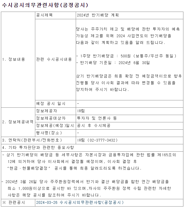 이번 반기 배당의 기준일은 2024년 6월 30일 입니다. 배당락일이 06월 27일 이므로 적어도 06월 26일 까지는 해당 주식을 매수해야지만 배당을 받을 수 있습니다.