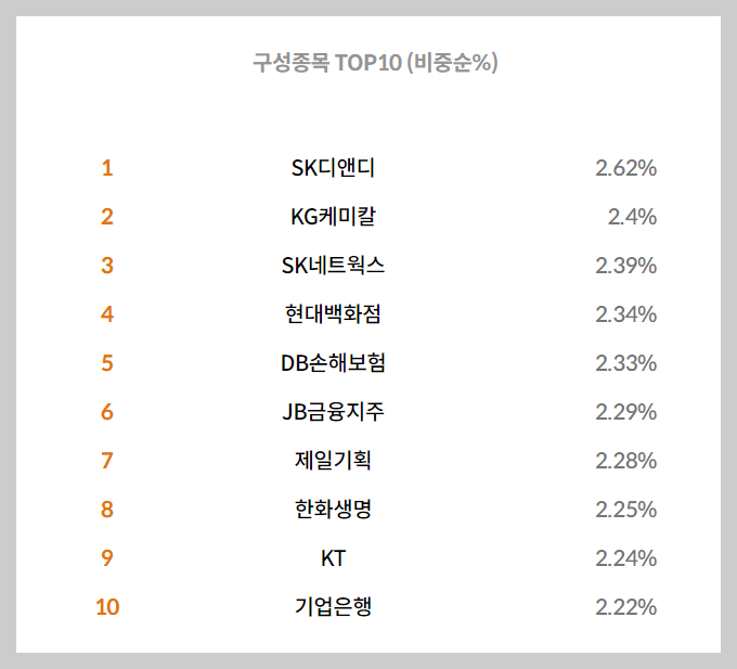 비중이 높은 종목은 SK디앤디가 구성되어있으며 그 뒤로 KG케미칼, SK네트웍스, 현대백화점, DB손해보험, JB금융지주, 제일기획, 한화생명, KT, 기업은행으로 상위 비중 종목들이 구성되어져 있습니다.