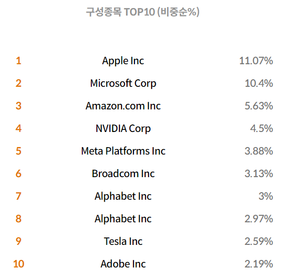 해당 ETF에서 비중이 제일 높은 순위별 비중이 위 그림과 같습니다. 상위 10개주으이 비중이 대략 50%의 비중을 차지할 정도로 해당 나스닥 지수에서는 큰 비중을 차지 합니다. 애플과 마이크로소프트, 아마존, 엔비디아, 메타, 브로드컴, 알파벳, 테슬라, 어도비 순위로 시가총액 1~10등까지의 순위를 차지하고 있습니다. 상위 10개의 주식에서 지수의 50%를 담담하고 있으니 10개의 주식들이 휘청이면 주가지수로 휘청일 수 있다는 증거입니다. 또한 그만큼 해당 주식들의 쏠림 현상이 심하여 버블의 요소도 존재할 수 있습니다.