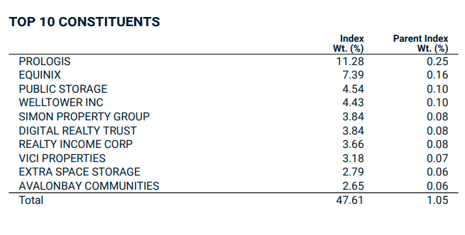 The MSCI US REIT Index is a free float-adjusted market capitalization weighted index that is comprised of equity Real Estate Investment Trusts (REITs). The index is based on the MSCI USA Investable Market Index (IMI), its parent index, which captures the large, mid and small cap segments of the USA market. With 123 constituents, it represents about 99% of the US REIT universe and securities are classified under the Equity REITs Industry (under the Real Estate Sector) according to the Global Industry Classification Standard (GICS®), have core real estate exposure (i.e., only selected Specialized REITs are eligible) and carry REIT tax status.