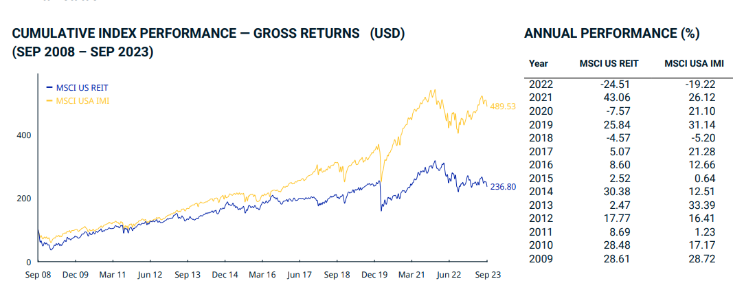 하지만 코로나가 발상하면서 재택근무 활성화와 공간에 대한 제약이 없어지는 시대가 도래하게 되면서 미국의 상업용 부동산, 쉽게 말해 한국말로는 상가와 오피스 지역들의 희소성이 많이 사라지게 되었습니다. 이러한 시대에서 리츠는 이제 투자자들의 외면을 받게 되면서 최근 수익률이 저조한 실적을 달성하게 되었습니다. 하지만 오피스와 상가이외에도 다른 임대공간 사업들이 각광을 받으면서 지수를 지탱하고 있는 추세 입니다. 데이터센터 임대, 창고 임대, 통신탑 임대 등 신시대에 걸맞는 다양한 부동산 산업이 각광을 받고 있습니다.